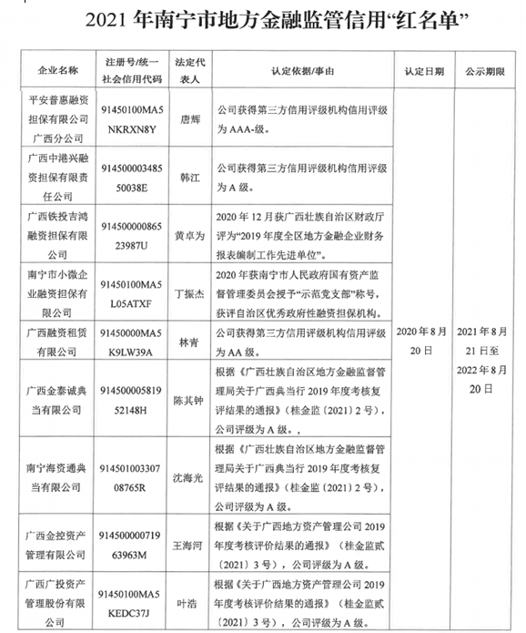 地方金融监管信用“红名单”评选是南宁市地方金融工作部门为了褒扬诚信,严惩失信,进一步推进地方金融领域信用体系建设,将相关企业进行信用“红黑名单”管理。而广投资管自经营以来,一直积极响应监管政策,非常重视信用评价工作,提高诚信、合法、合规经营意识,不断完善提升综合管控水平。同时积极配合各级地方金融监管机构的信用评价,先后斩获了2018年至2020年连续三年AA主体信用评级企业、2019年度A级广西地方资产管理公司监管评级企业、2020年A级纳税信用等级企业等荣誉。